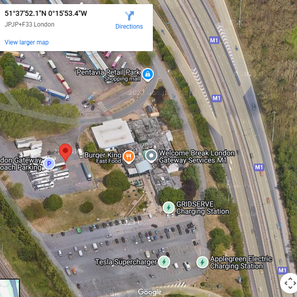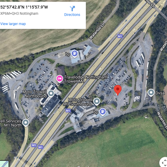 Boarding point is from the coach parking area at Tibshelf services on the M1 Southbound